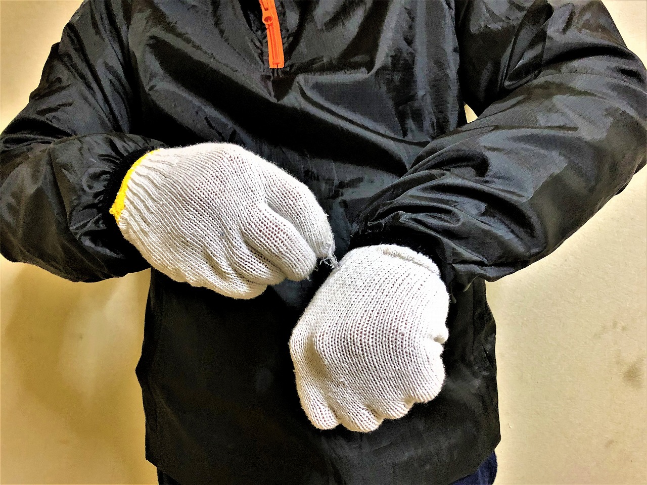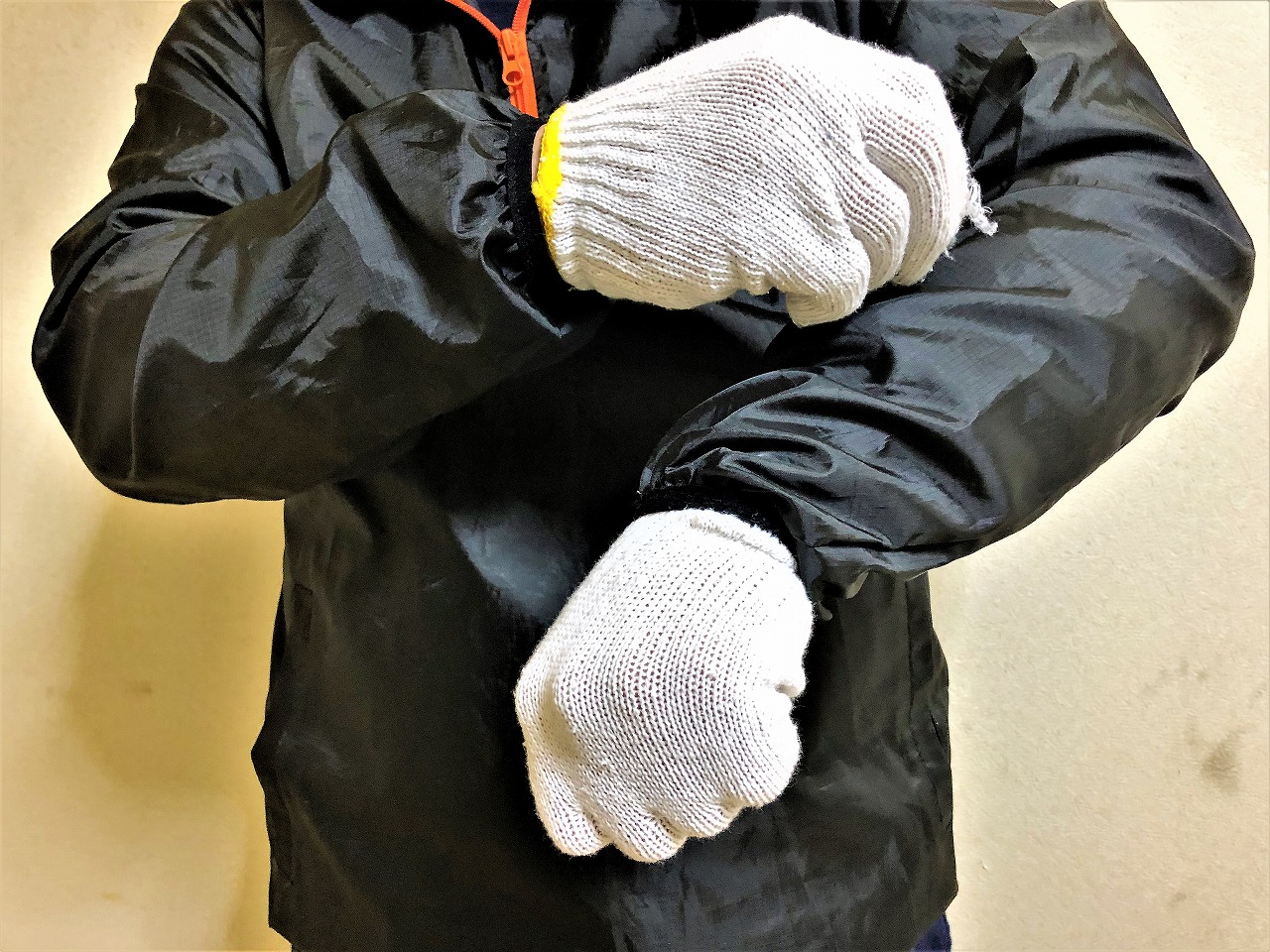 左腕の袖口辺りで、右手をVの字に動かして、表現しています。