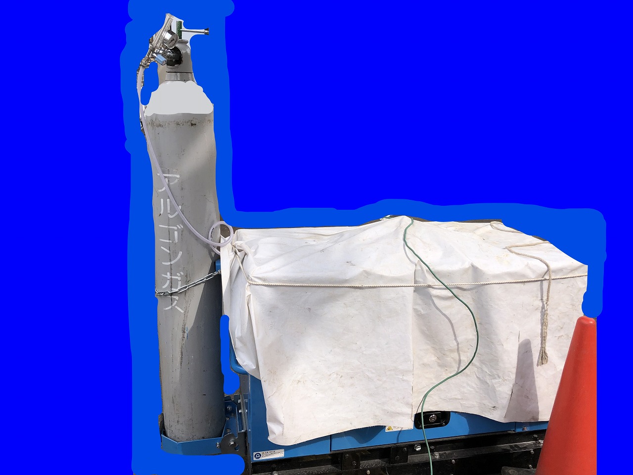 写真の様に、「TIG溶接機」に併設された台があれば、「アルゴンガス」を併設する事が出来ますが、無い場合は下の写真の様に、近くの固縛できる物にチェーンで固縛します。